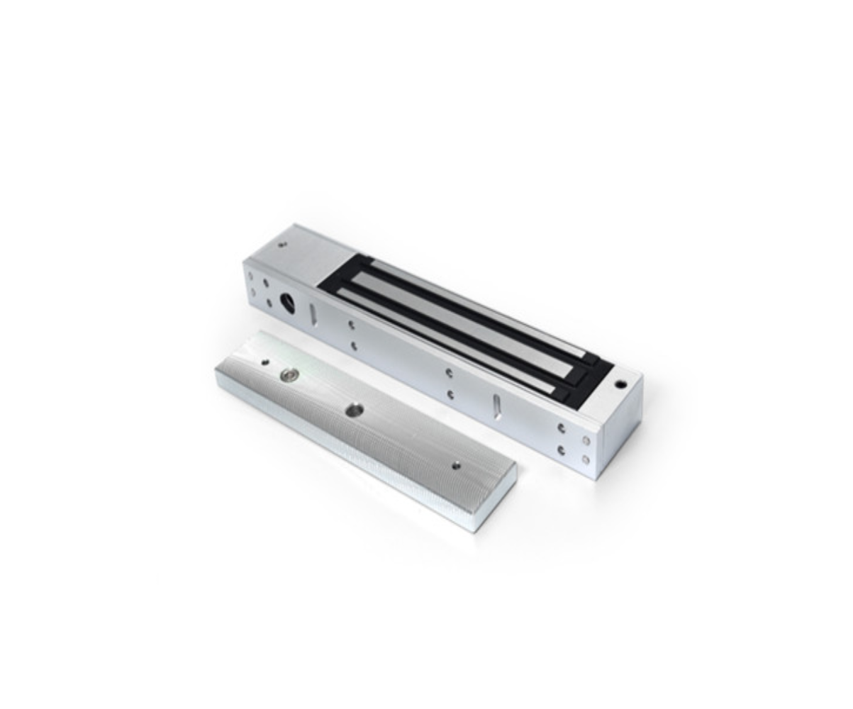 Electroimán fuerza de retencion 280KL (600 Lbs), uso en interior. Dimensiones: cerradura: 250L * 47W * 25.5H mm, placa: 180L * 38W * 11H mm. Con led indicador.