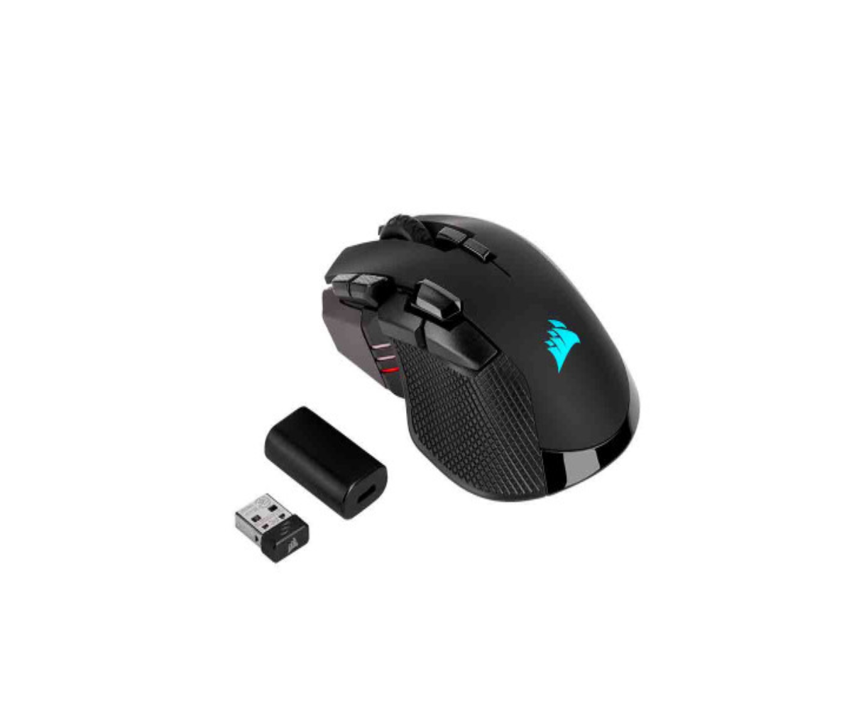 El mouse de juego CORSAIR IRONCLAW RGB WIRELESS combina un sensor óptico de 18 000 ppp nativos con un cómodo agarre para la palma. Puede conectarlo fácilmente al PC a través de una tecnología ultrarrápida, la TECNOLOGÍA SLIPSTREAM CORSAIR WIRELESS en menos de 1 ms, Bluetooth o conexión por cable USB